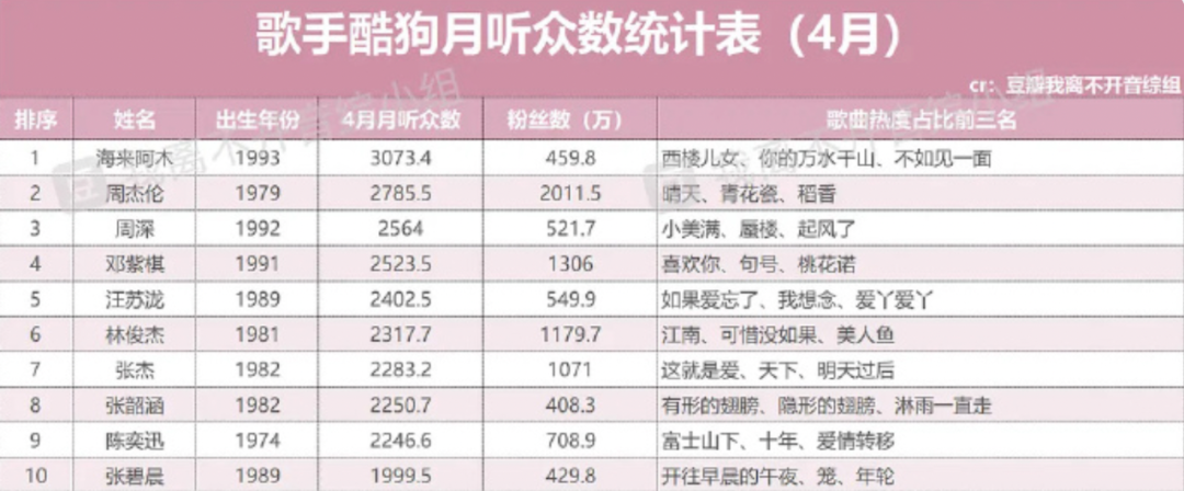 然而,这样做的结果注定是“费力不讨好”,这份令人迷惑的首发名单,暴露芒果试图讨好更多圈层的扭捏姿态。不少《歌手2024》的观众都对海来阿木这个名字感到陌生,殊不知在酷狗上他是播放量超越周杰伦的存在,更手握数首抖音百亿神曲。仅此一点,就足以说明音乐圈层之间的隔阂之深。