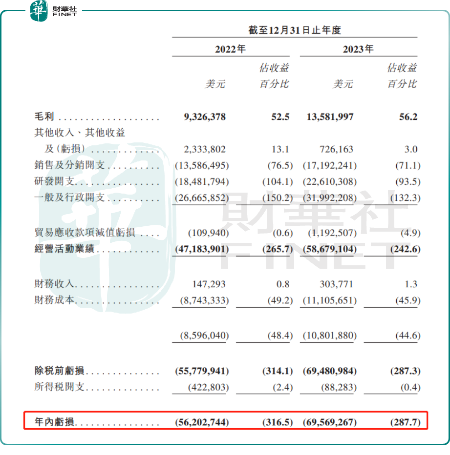 最新招股书显示,2022年、2023年,觅瑞集团分别实现营收1775.90万美元、2418.50万美元;年内亏损分别为5620.27万美元、6956.93万美元。