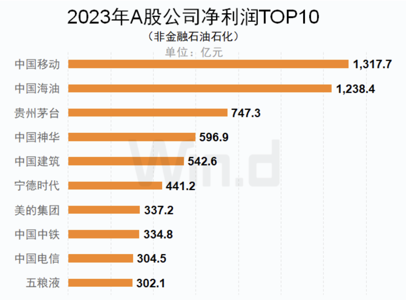 剔除两油和金融类公司后,中国移动以1317.66亿元的净利润成为去年最赚钱的公司,中国海油、贵州茅台、中国神华、中国建筑和宁德时代分别以1238.4亿元、747.3亿元、596.9亿元、542.6亿元和441.2亿元的净利润紧随其后。