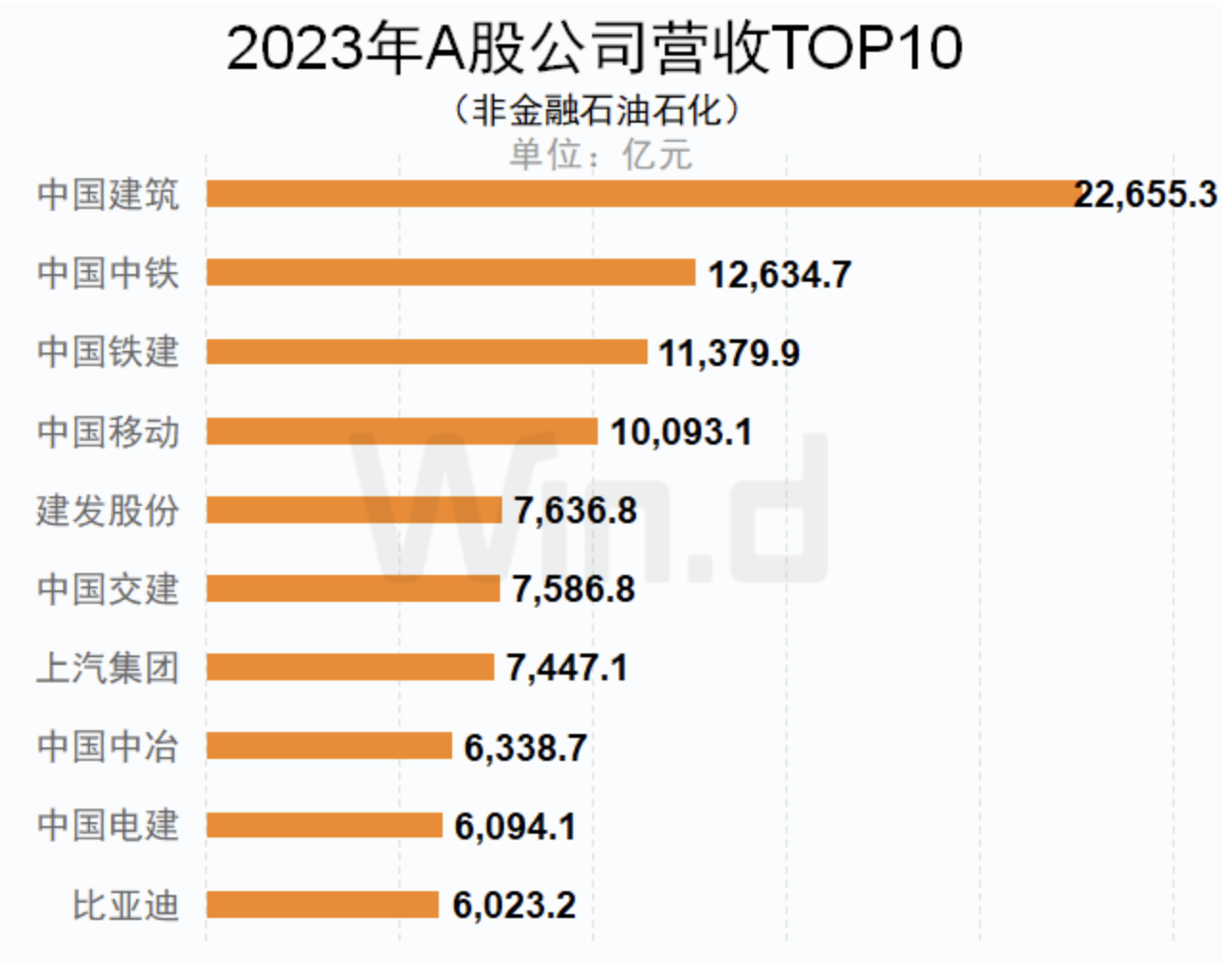 在营收排行榜的前10名中,多数来自中央国有企业。中国石化和中国石油均以超3万亿元的收入稳居榜单前二名。剔除石油石化及金融企业后,中国建筑,中国中铁及中国铁建三家国有建筑工程企业排名前三。