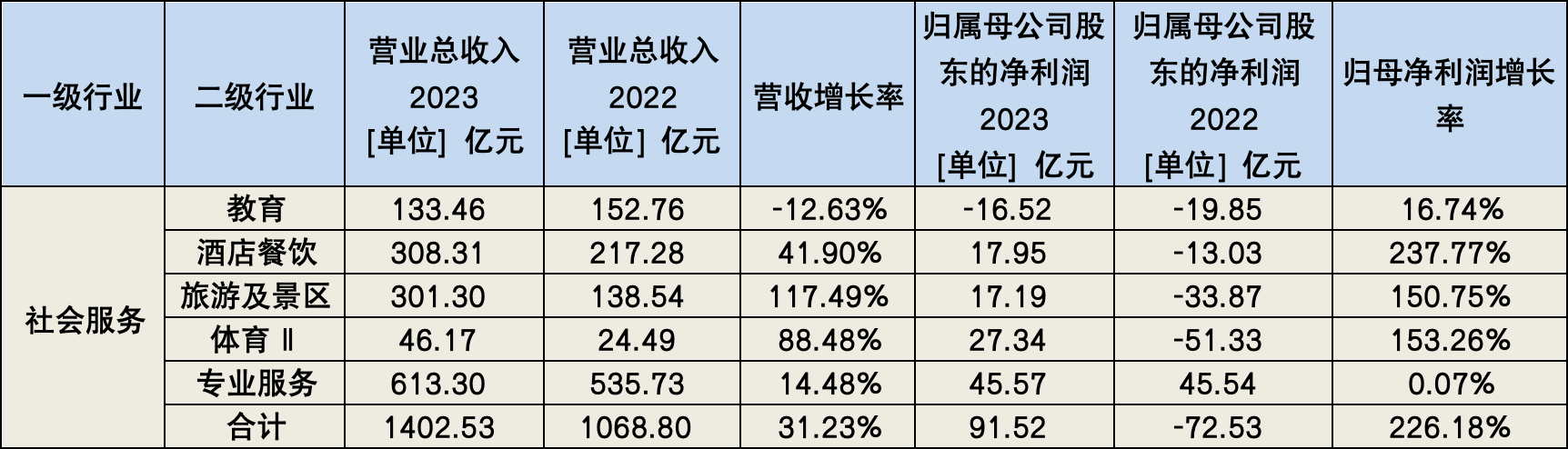 钛媒体APP注意到,2023年社会服务行业实现营收1402.53亿元,同比增长31.23%。同时,其净利润从2022年的-72.53亿元一举来到91.52亿元,增长率高达226.18%,在申万31个一级子行业中的排名也从倒数第七升至第二,实现“逆袭”。