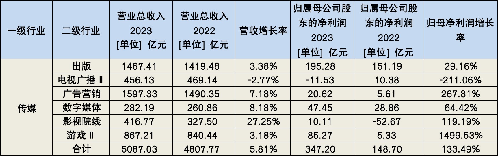 去年另一个实现逆袭的是传媒行业。2023年,传媒行业实现营收5087.03亿元,同比增长5.81%;净利润从2022年的148.70亿元增至347.20亿元,增速达133.49%,在一级行业中排名从2022年的倒数第三一举升至第三名。