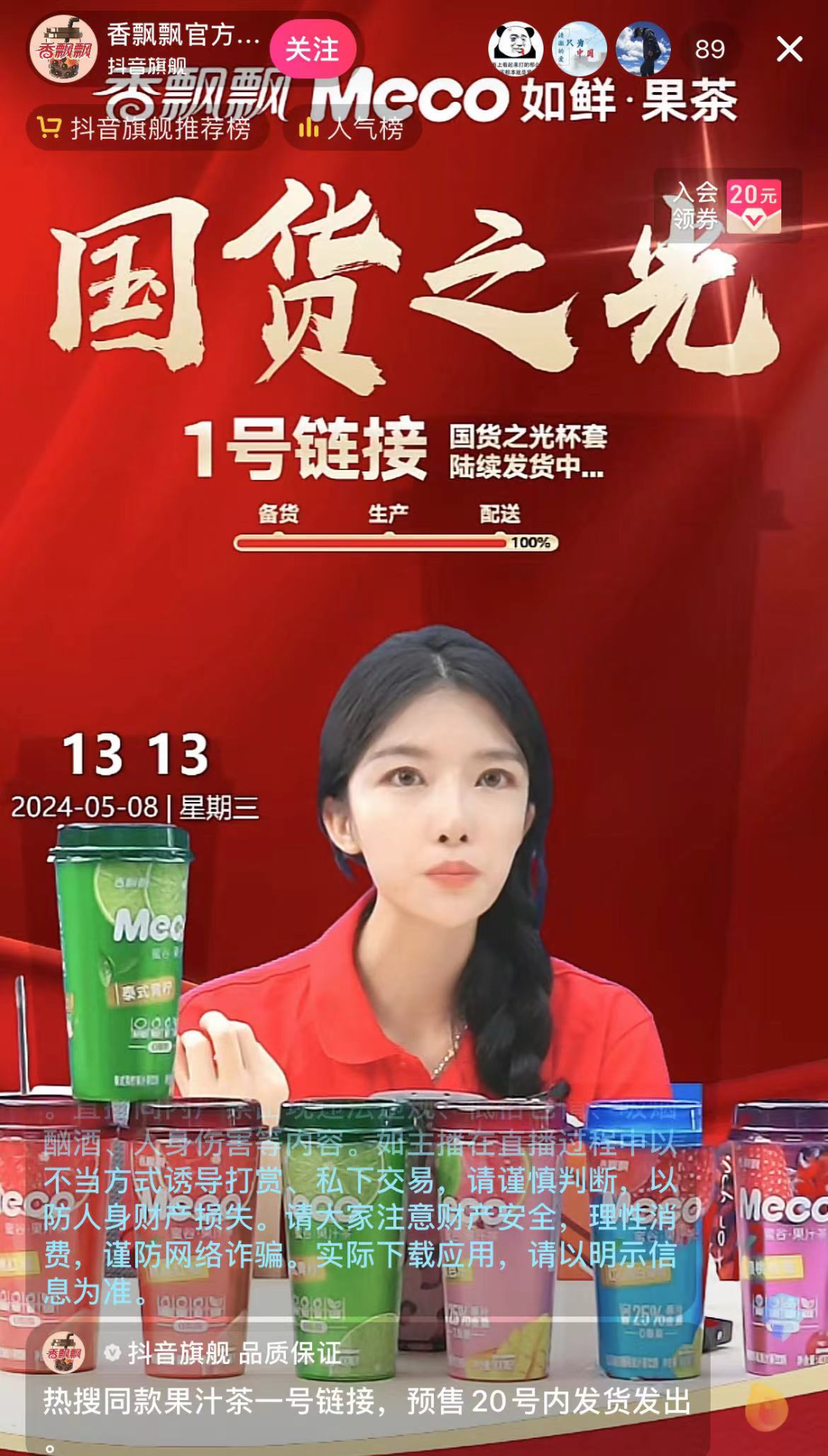 在讽刺日本核污水后,5月5日下午,香飘飘直播间同时万人在线观看,主播身着贴有中国心的红色衣服,多款商品被售罄。这期间,还有香飘飘总裁杨冬云进入直播间与网友互动,并发放了直播间福利。5月4-5日,共有超千万名网友涌入香飘飘抖音直播间下单,店铺直播日销售额由原来的2500元暴涨至100万元,涨幅高达400倍。
