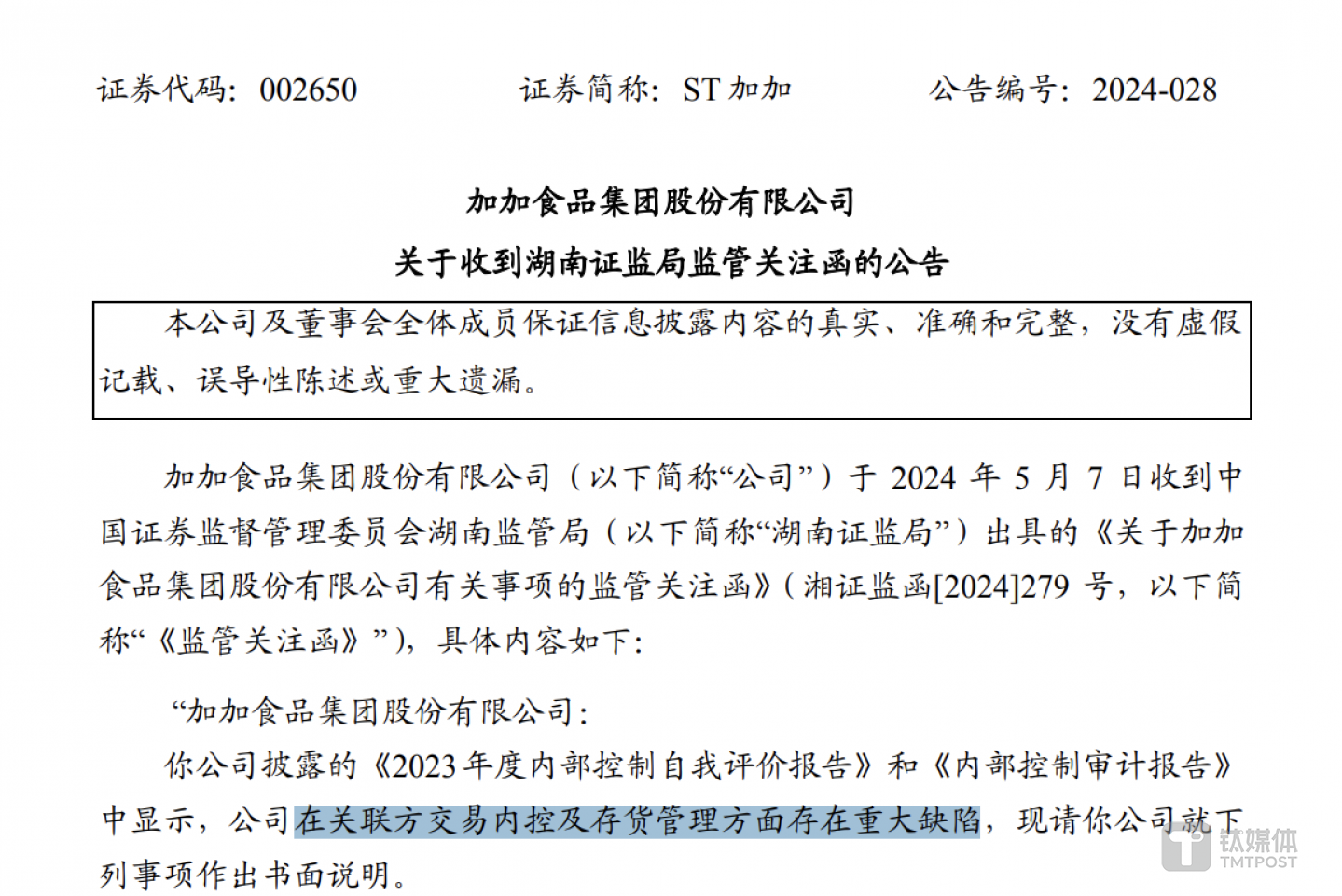 5月7日,ST加加(即加加食品,002650.SZ)因在关联方交易内控及存货管理方面存在重大缺陷,公司收到湖南证监局出具的监管关注函。三小时后,交易所对公司下发的2023年年报问询接踵而至。
