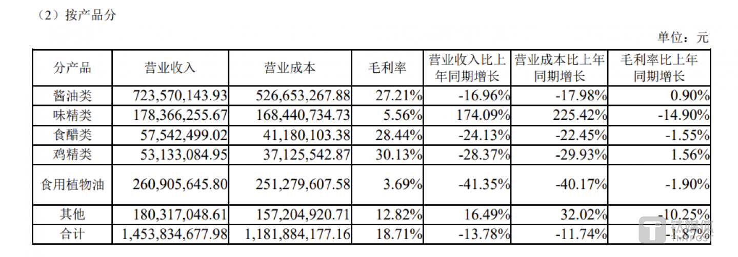一同被追问的还有公司的毛利率。2023年,公司的毛利率为18.71%,同比下滑了1.87个百分点。分产品来看,除了酱油类毛利率有所上升之外,食醋类、鸡精类、食用植物油产品、味精类产品的毛利率均出现不同程度的下滑。