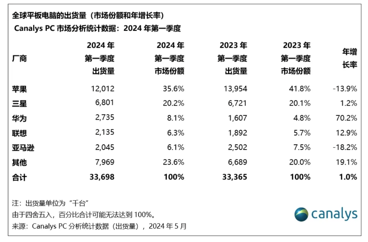 市场数据也证明,趾高气昂的iPad已经遭到了市场的「毒打」。根据Canalys的数据,iPad在2024年第一季度的出货量比去年同期,减少了1942万台,同比下滑了13.9%;根据苹果财报,2024年第一财季,iPad收入较上年同期下降25%;2024年第二财季,苹果收入同比下降16.64%。