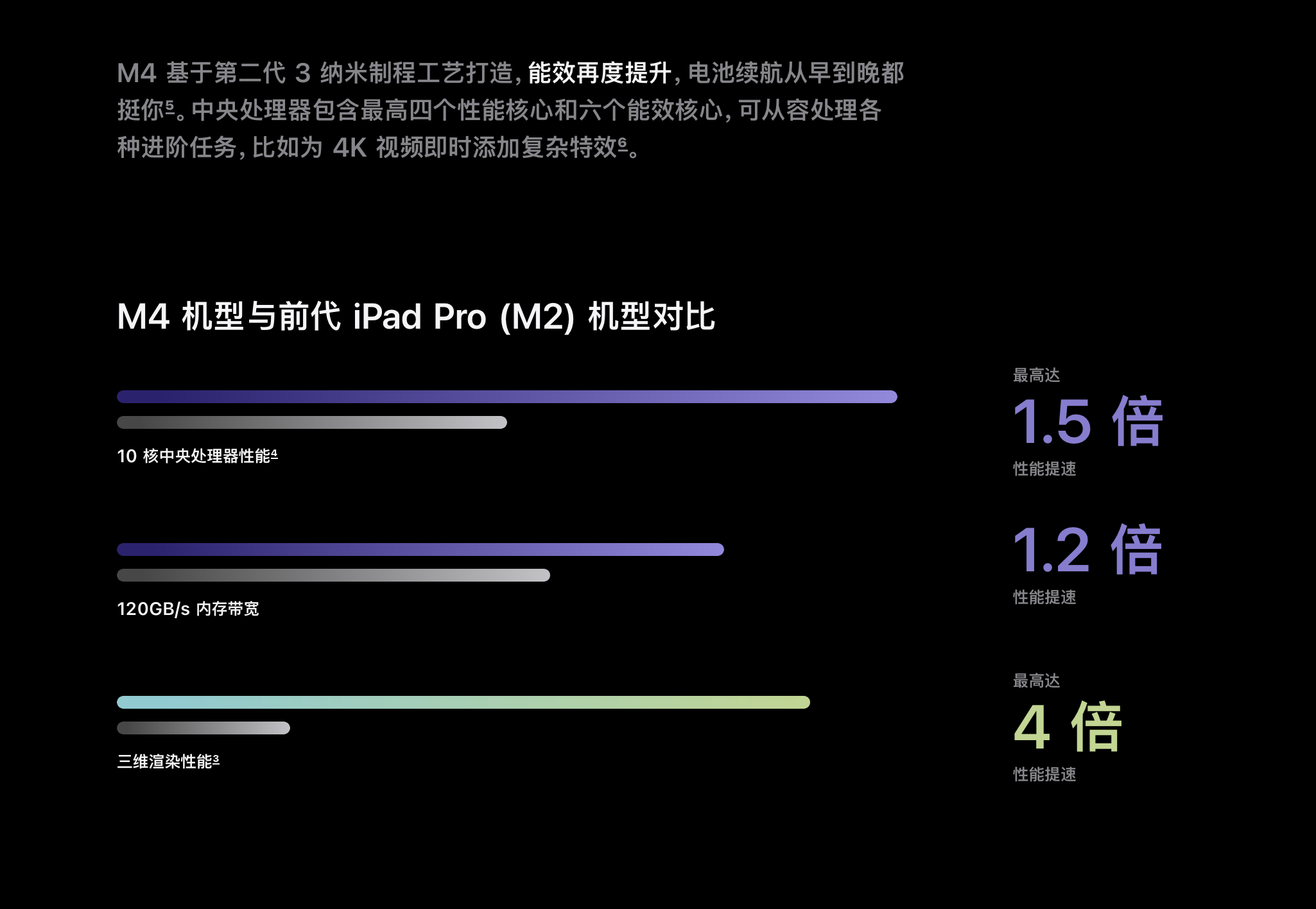 新款iPad Pro的第一个升级点是M4芯片,作为M系列芯片最新作品,苹果M4芯片采用第二代3nm制程,以及「4个性能核心+6个能效核心」的CPU,CPU性能据称相较M2芯片提升50%;M4芯片还加入了全新显示引擎,其GPU为10核架构,较M2芯片提速4倍,并首度支持光线追踪。而且苹果还表示,在16核神经网络引擎的加持下,M4的运算速度可以达到每秒38万亿次,非常适合处理各种AI任务。
