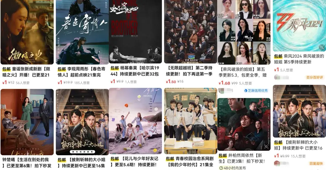 在闲鱼上,《微暗之火》《春色寄情人》《哈尔滨1944》《乘风2024》《花儿与少年好友季》等平台热播剧综像打折清仓的商品一样摆在柜台、随处可见,已完结的全集打包售卖,没有完结的按正片更新的节奏标注,并在帖子里强调“包完结”,每部售价一块到两块不等,秒拍秒发货。结合最近的售卖记录来看,一个账号每天能卖十几单。