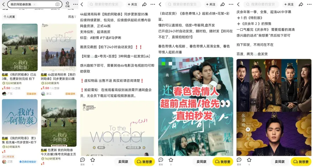 5月7日晚,颇受期待的《我的阿勒泰》刚在爱奇艺上线,盗版资源就登陆二手平台闲鱼,卖家写道“已更3集,拍下秒发,本帖持续更新到大结局”。这不是例外,上月末,李现、周雨彤主演的《春色寄情人》开启大结局点映,两个小时内全集资源就在全网铺天盖地,盗版卖家不仅打起价格战,还“卷”起了服务——买盗版《春色寄情人》赠送原著小说、花絮彩蛋,甚至还给未上映的《庆余年2》开了预售链接,包送第一季资源。