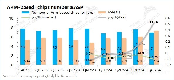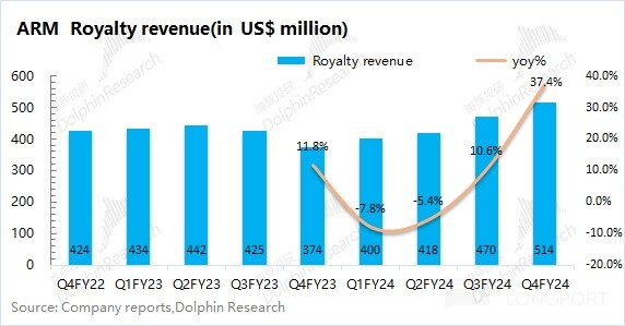 ARM 的版税授权业务在 2024 财年第四季度(即 24Q1)实现营收 5.14 亿美元,同比增长 37.4%。版税授权业务的增长,主要得益于均价的提升。