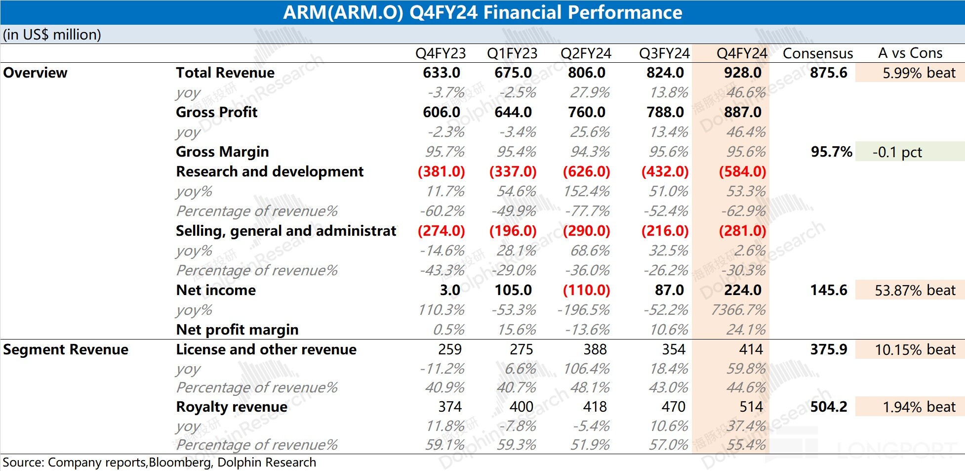 1、整体业绩: 增收不增利。ARM 在 2024 财年第四季度(即 24Q1)实现营收 9.28 亿美元,同比增长 46.6%,超市场预期(8.75 亿美元)。收入端的持续增长,得益于许可证业务和版税业务的双重拉动;$ARM.US 本季度毛利率 95.6%,同比下滑 0.1pct,基本符合市场预期(95.7%),稳定在 95% 以上的高毛利率水平。