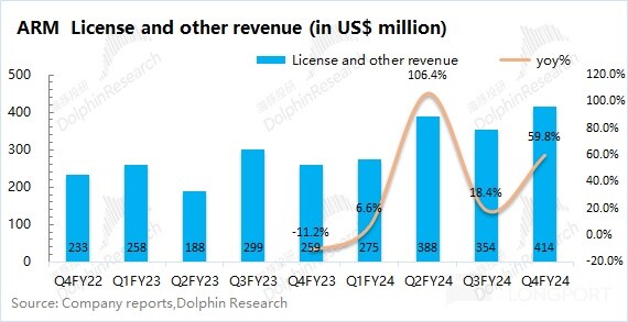 ARM 的许可证业务在 2024 财年第四季度(即 24Q1)实现营收 4.14 亿美元,同比增长 59.8%。随着 AI 等需求的增长,下游有更多的客户采用 ARM 来研发芯片。