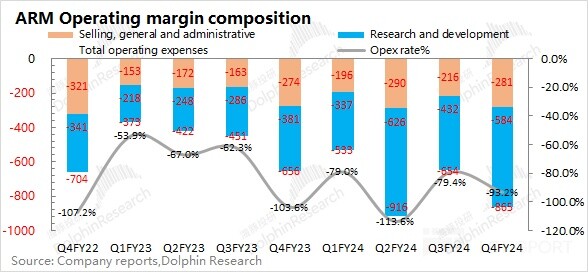 ARM 在 2024 财年第四季度(即 24Q1)的经营费用为 8.65 亿美元,同比增长 31.9%。公司保持高投入,继续扩大研发人员规模。