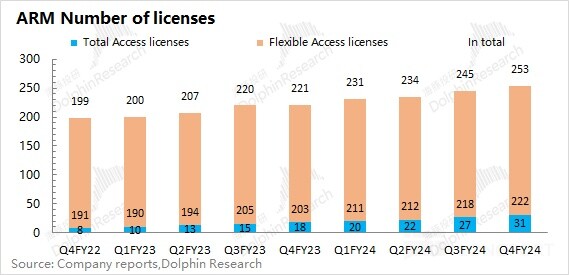 2、各业务细分:许可证&版税,继续增长。受 AI 等需求的带动,公司许可证客户数目继续提升。虽然受半导体周期影响,ARM 授权芯片数目有所下滑,但单颗芯片授权费用同比提升 53.1%。