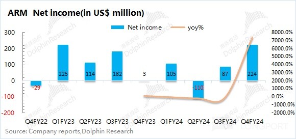 ARM 在 2024 财年第四季度(即 24Q1)实现净利润 2.24 亿美元,同比/环比均有明显提升,好于市场预期(1.45 亿美元)。本季度净利率 24.1%。