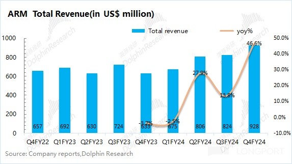 ARM 在 2024 财年第四季度(即 24Q1)实现营收 9.28 亿美元,同比上升 46.6%,超市场预期(8.76 亿美元)。公司本季收入继续提升,再创新高,得益于许可证业务和版税业务的双重拉动。
