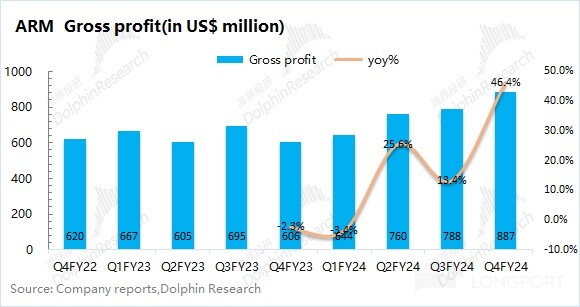 ARM 在 2024 财年第四季度(即 24Q1)实现毛利 8.87 亿美元,同比增长 46.4%。毛利端同比增速与收入接近。