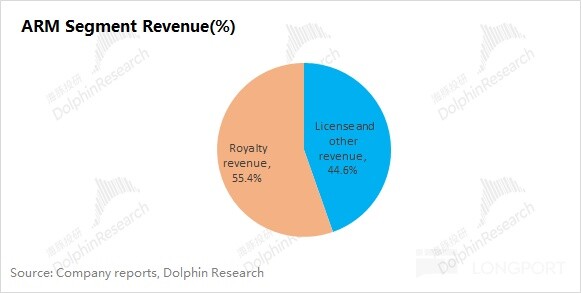 从 ARM 的分业务情况看,本季度的许可证业务和版税业务快接近 55 开。公司业务当前主要受益于 AI 等需求的拉动,本季度版税收入占比为 55%。许可证业务占比为 45%。