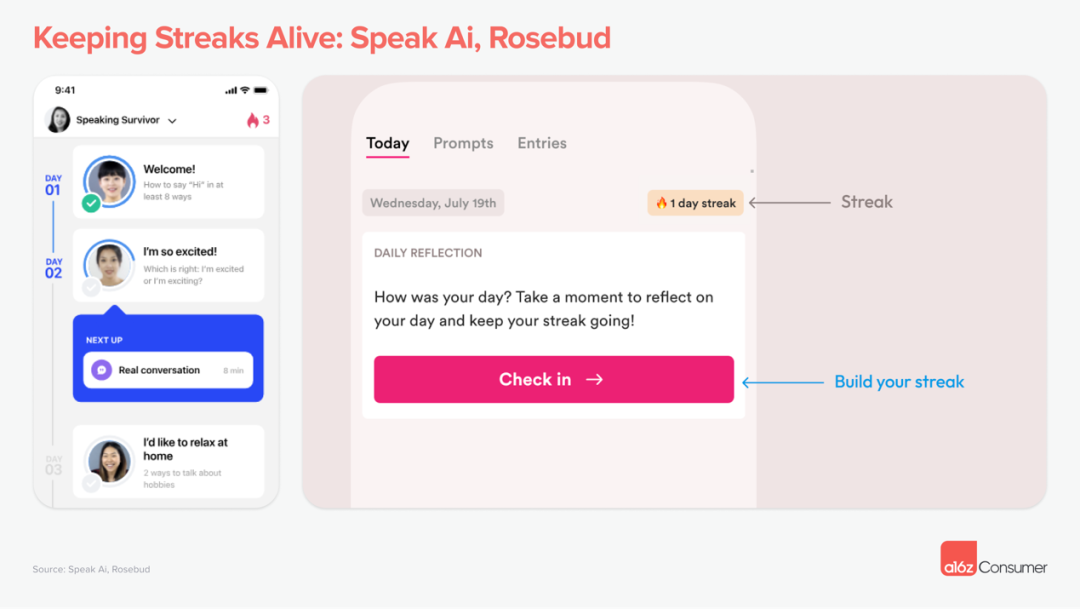 AI原生产品开始以一种周到的方式利用这一点——特别是对于那些核心产品价值在于习惯化的产品。对于Speak Ai(一个AI语言导师)和Rosebud(一个AI日记产品)来说,习惯化是它们价值主张的重要组成部分。因此,这些产品内置了连续性功能,奖励用户回来。