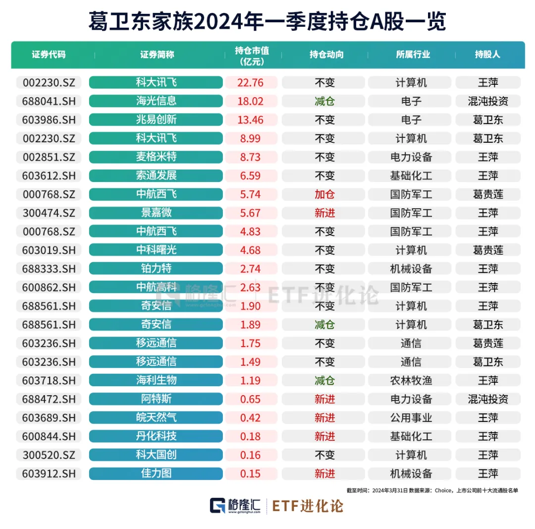 期货大佬葛卫东在二级市场偏爱科技股,根据上市公司前十大流通股东明细,2024年一季度末,葛卫东及其家族合计持股18家公司,持股总市值达到114.62亿元。其中,持仓市值超5亿的公司包括科大讯飞、海光信息、兆易创新、麦格米特、索通发展、中航西飞和景嘉微。