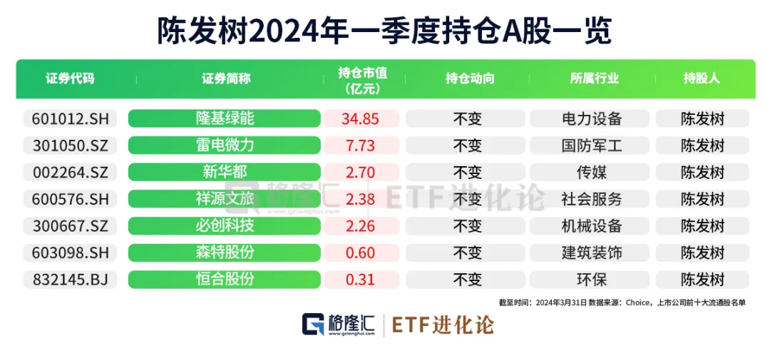 陈发树一季度共持有7家公司,分别是隆基绿能、雷电微力、新华都、祥源文旅、必创科技、森特股份和恒合股份,合计持股市值为50.83亿元,相对于去年末其持仓未发生变化。
