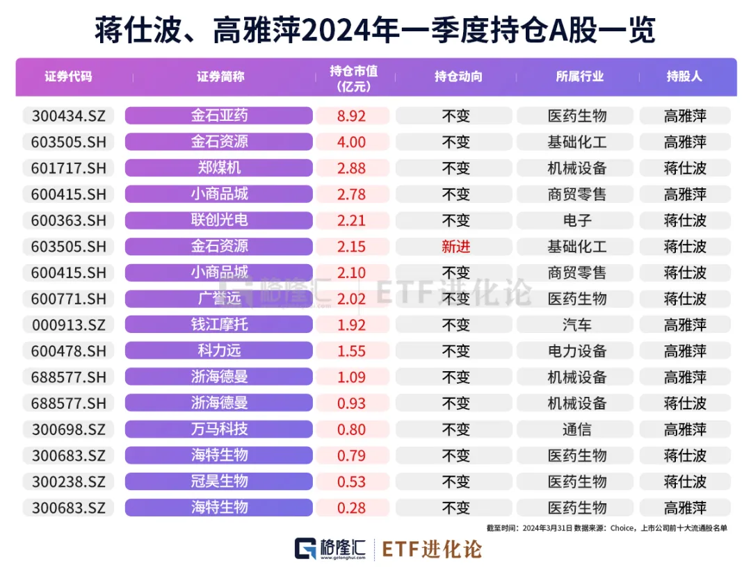 靠期货发家的牛散蒋仕波,与其妻子高雅萍在一季度末各持股8家公司,总持仓市值合计为34.95亿元,新进金石资源,第一重仓股劲金石亚药。