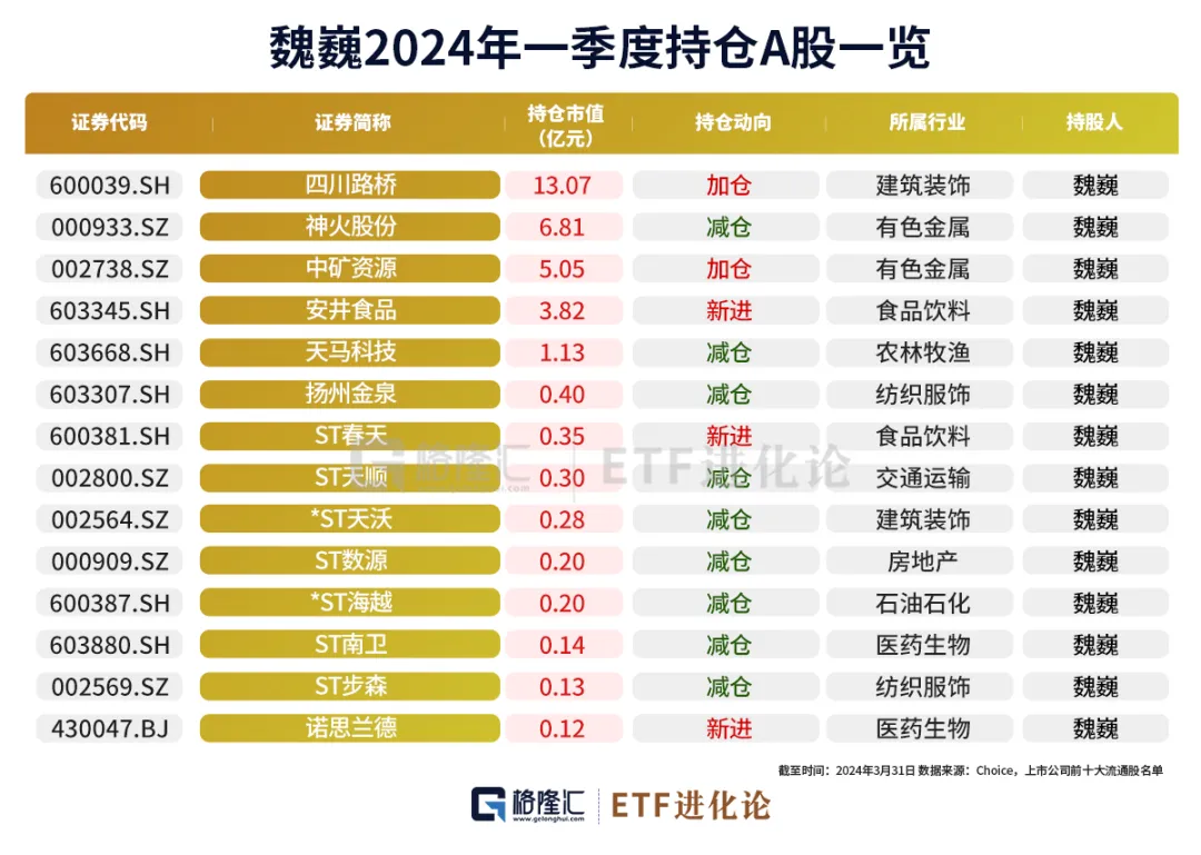 魏巍一季度现身14家公司流通股名单,合计持股市值为32亿元,持仓多为小盘股和ST股,持仓市值超10亿的公司有一家四川路桥,超5亿的两家神火股份和中矿资源。