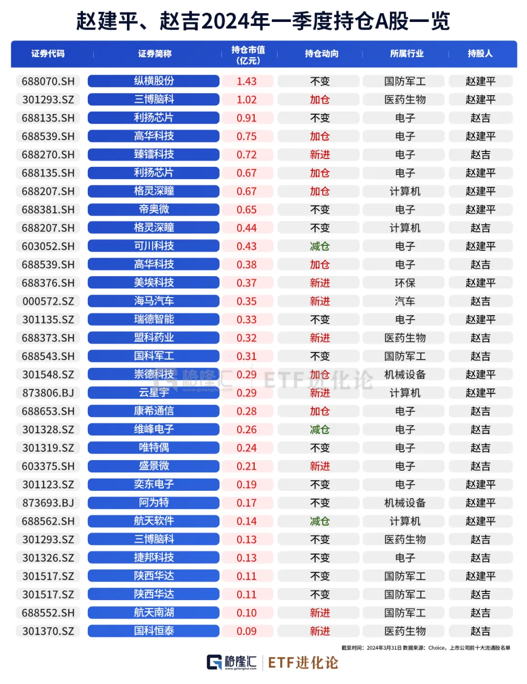 赵建平、赵吉父女一季度合计持股31家公司,持股市值12.49亿元,13家公司持股不变,新进8家公司,加仓7家公司,减仓3家公司,持仓市值超1亿的公司两家纵横股份和三博脑科。