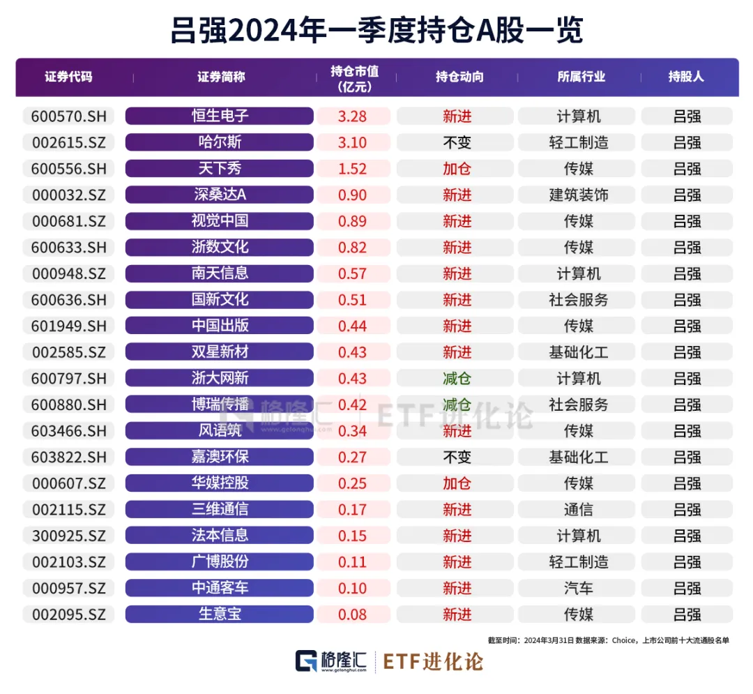 最忙牛散吕强一季度持有20家公司,合计持股市值为14.78亿元,持仓超过3亿的公司两家恒生电子和哈尔斯。