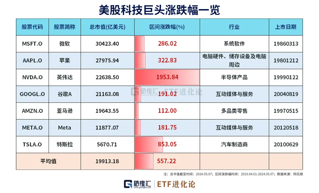 在过去5年,美股科技七巨头平均涨幅557%,其中英伟达涨幅高达1954%。