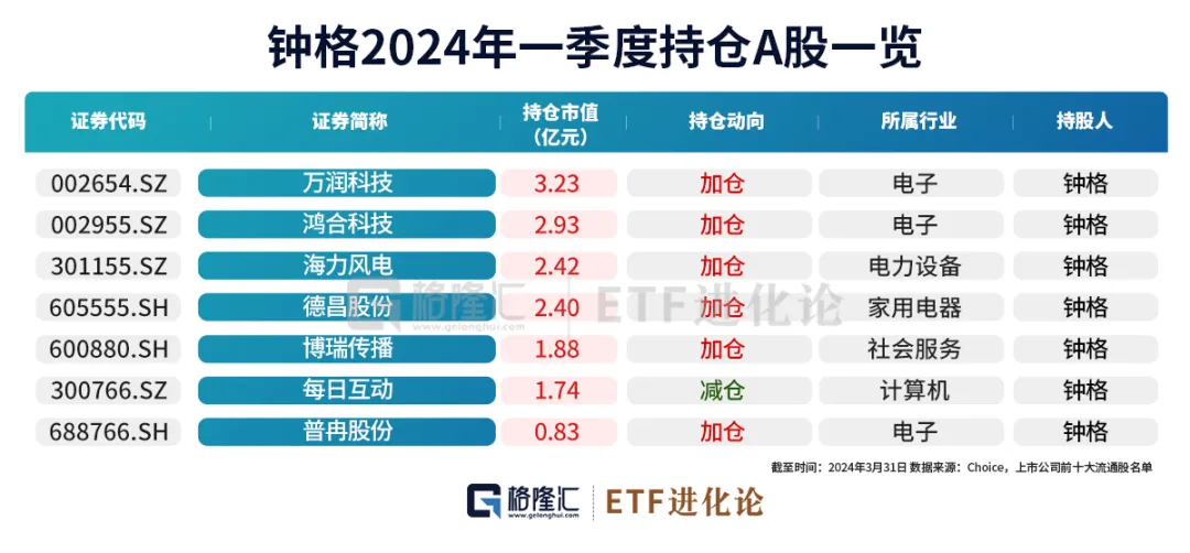 钟格偏爱小盘股,一季度持有7家公司,合计持股市值为15.43亿元。相比去年末,加仓6家公司万润科技、鸿合科技、海力风电、德昌股份、博瑞传播和普冉股份,减仓每日互动。