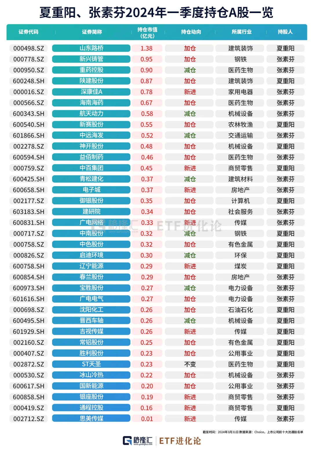 夏重阳、张素芬夫妇一季度合计持股35家公司,持股市值合计14.68亿元,持仓在一季度大变动,新进9家公司,加仓17家公司,减仓8家公司,持仓超过1亿的公司仅有一家山东路桥。