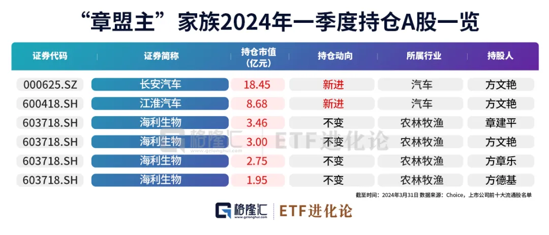 “章盟主”章建平家族现身3家公司,一季度持股总市值为38.29亿元。新进2家汽车公司长安汽车和江淮汽车,对海利生物持仓不变。
