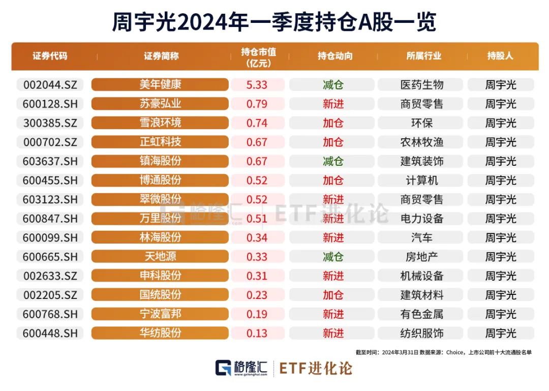 周宇光一季度持有14家公司,新进7家公司,加仓4家公司,减仓3家公司,持股总市值为11.28亿元,头号重仓股是美年健康。