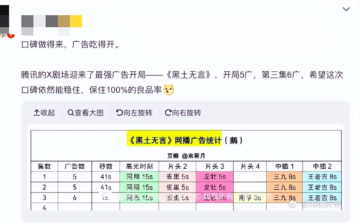 招商能力层面,不仅是提供了剧场和单剧招商两种模式,爆款效应所带来的加成也在剧场被放大:最近的案例,《漫长的季节》火爆出圈、《繁城之下》的口碑效应,带给X剧场的市场信任都高效作用于后面的剧集,开年播出的《黑土无言》不算“亮眼”却成为当时少有的全集有广剧集,在今年Q1表现突出。