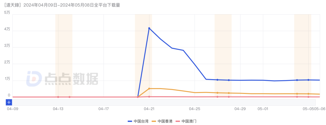 下载量方面,点点数据显示,截至2024年5月9日,《道天录》在港澳台双端市场累计下载量约为31万次,其中,台湾市场占比约为85%。
