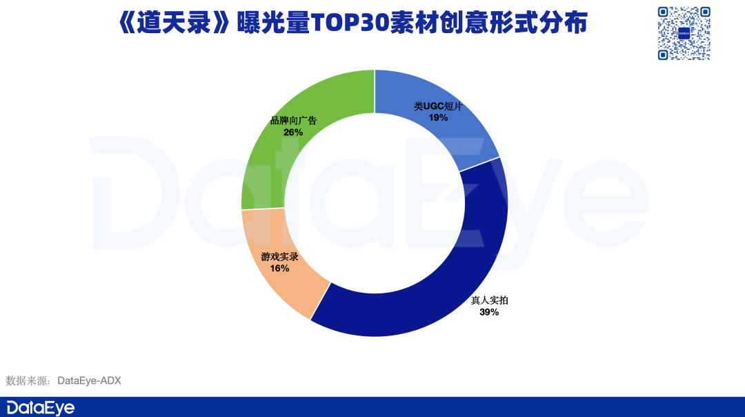 DataEye研究院整理了《道天录》曝光量TOP30的高效素材,其投放素材创意形式分布较为均匀,其中,真人实拍素材占比稍高,占比约为39%,同时也会辅以一些品牌向广告、类UGC短片素材。