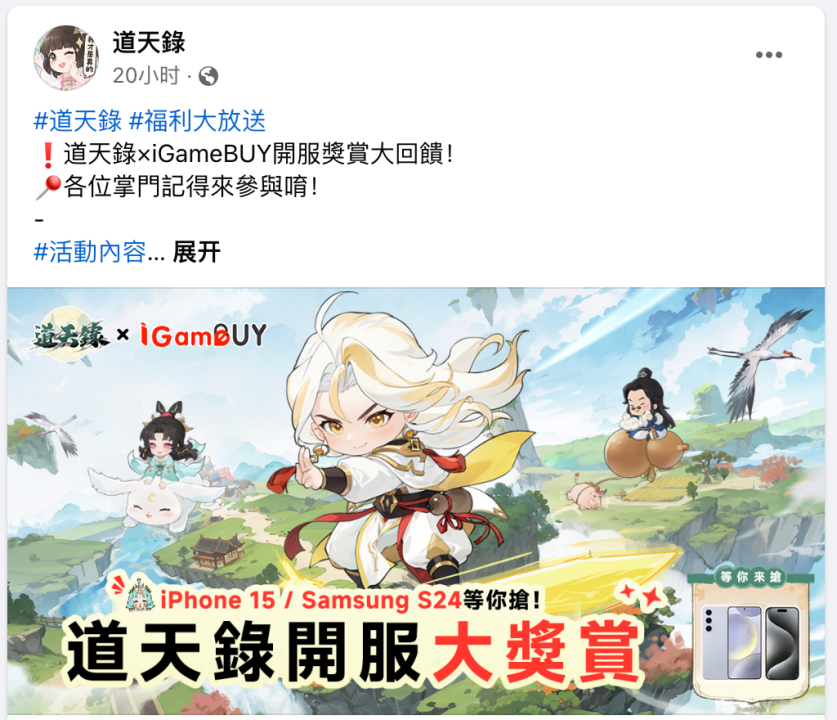 在Facebook平台,《道天录》拥有7.4万的粉丝数,且传播内容主要集中在福利派送、游戏角色介绍等方面。