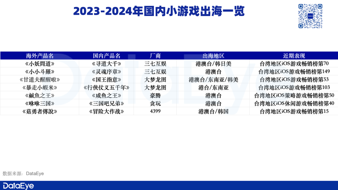 DataEye研究院不完全统计,从去年开始就有不少国内头部小游戏产品开始了海外掘金之路,其中包括《寻道大千》《三国吧兄弟》《冒险大作战》等等,而且均有不俗的市场表现。