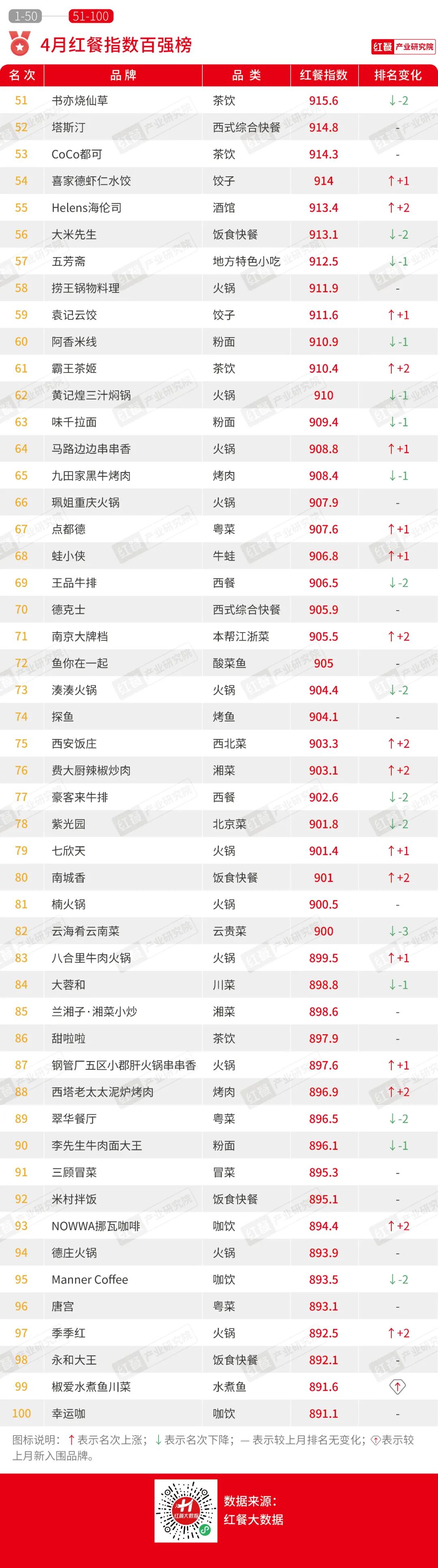 4月的“红餐指数百强榜”较3月有了新的变化。其中,品牌名次上升的有32个,名次下降的有29个,名次不变的有38个,新上榜品牌1个。不过,排名前十的品牌整体变动不大,前三名分别是肯德基(中国)、麦当劳(中国)以及海底捞,瑞幸咖啡、星巴克(中国)、蜜雪冰城紧随其后。