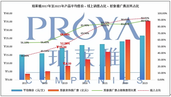 从2020年起,珀莱雅管理层将增长策略由“渠道驱动”转变为“产品驱动”,并将公司业务定义悄无声息的改为“公司致力于构建新国货化妆品产业平台”。数据上,珀莱雅在2019年已经开始进行战略转型:(1)当年线上营业占比超过线下;(2)销售费用中的“形象推广费”大幅增长67.8%,占销售费用比重大幅提升9.44个百分点至52.98%;(3)公司口径下平均售价提升20%至19元/支。2023年,线上销售占比为92.92%,“形象推广费”占销售费用比重为88.97%,绝对值增幅为46.03%。