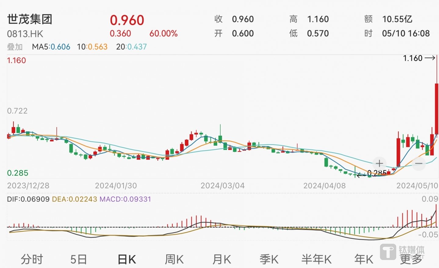 截至5月10日港股收盘,世茂集团股价报收0.96港元,涨幅达60%,成交额为10.55亿港元,当前公司总市值约36.46亿港元。
