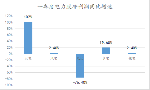利润暴涨是火电股价大涨并领跑电力板块的核心逻辑。今年一季度,火电公司利润涨幅在电力股中遥遥领先。火电板块净利润同比增长102%。水电、核电、风电净利润同比增速在2%-20%之间,光伏发电由于受供给过剩的影响,板块净利润出现负增长。
