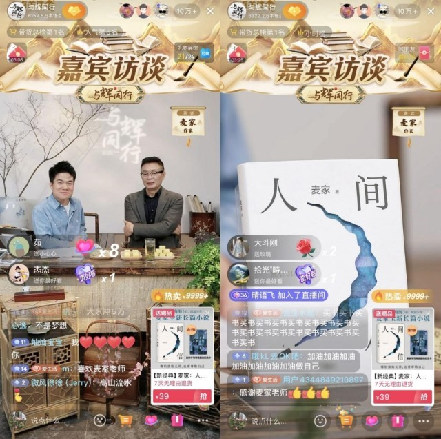 董宇辉直播间一次次成为文学新书发布会:麦家携打磨5年的最新长篇《人间信》做客,超过25万人同时在线观看,成功售出6.8万册。截至目前,《人间信》总销量已突破10万册。其他访谈对象还有诺奖得主古尔纳。