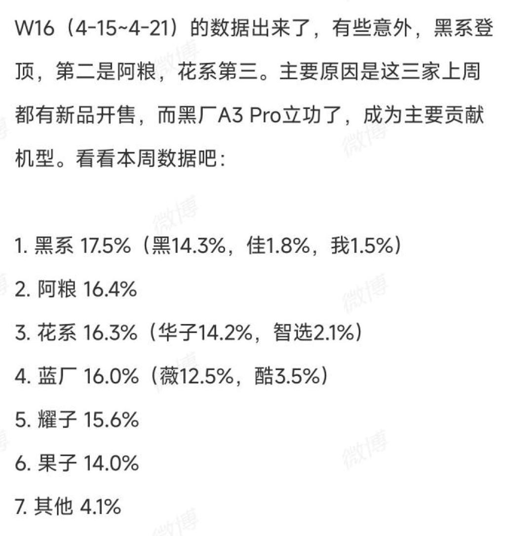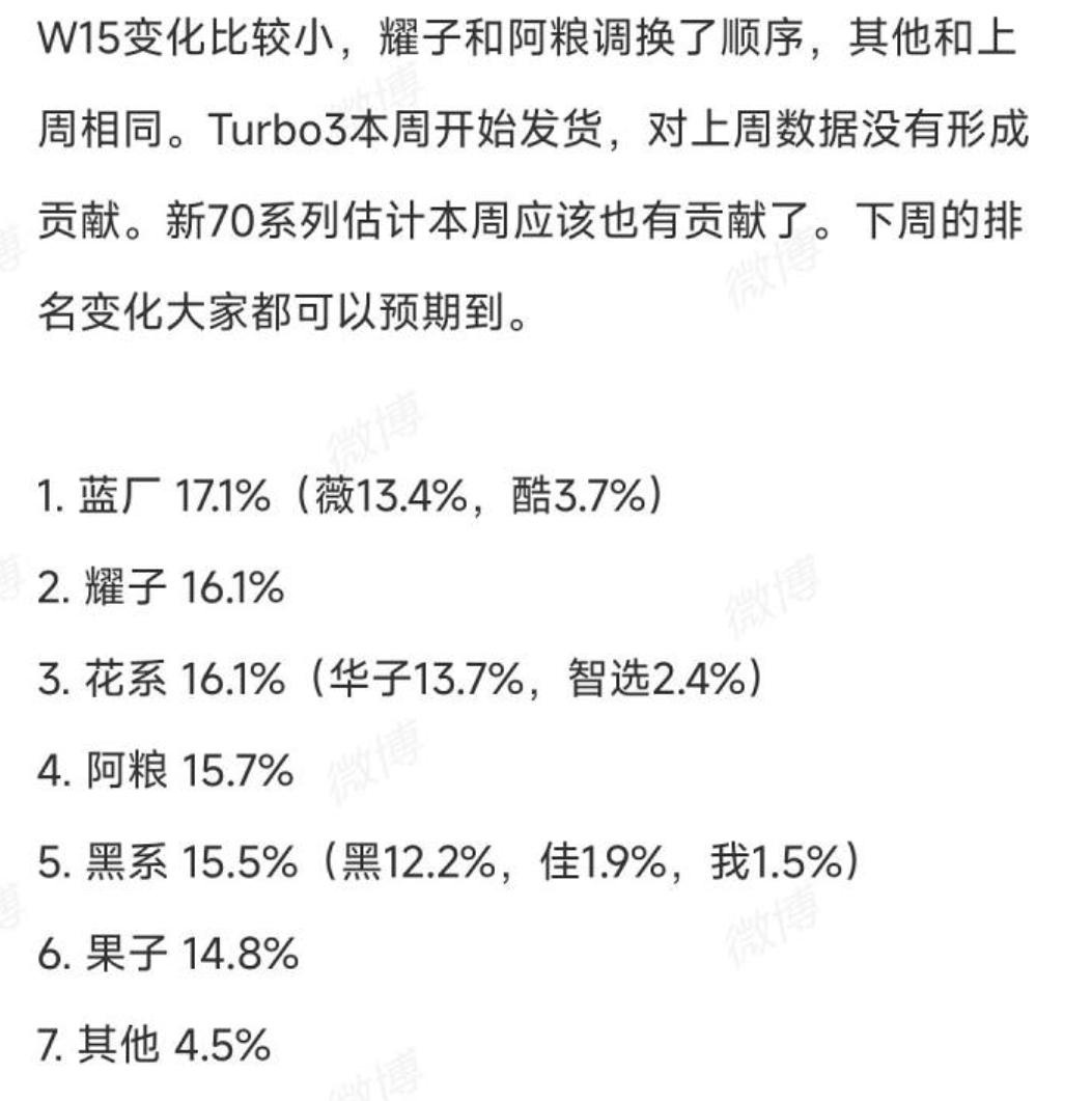 若对比GT Neo6 SE 发布后的W15和W16数据,realme的市场份额均为原地踏步的1.5%,甚至可以说GT Neo6 SE的发布没有给realme带来一丝份额的增长,不知道realme急匆匆发布新手机是否也是受此影响。