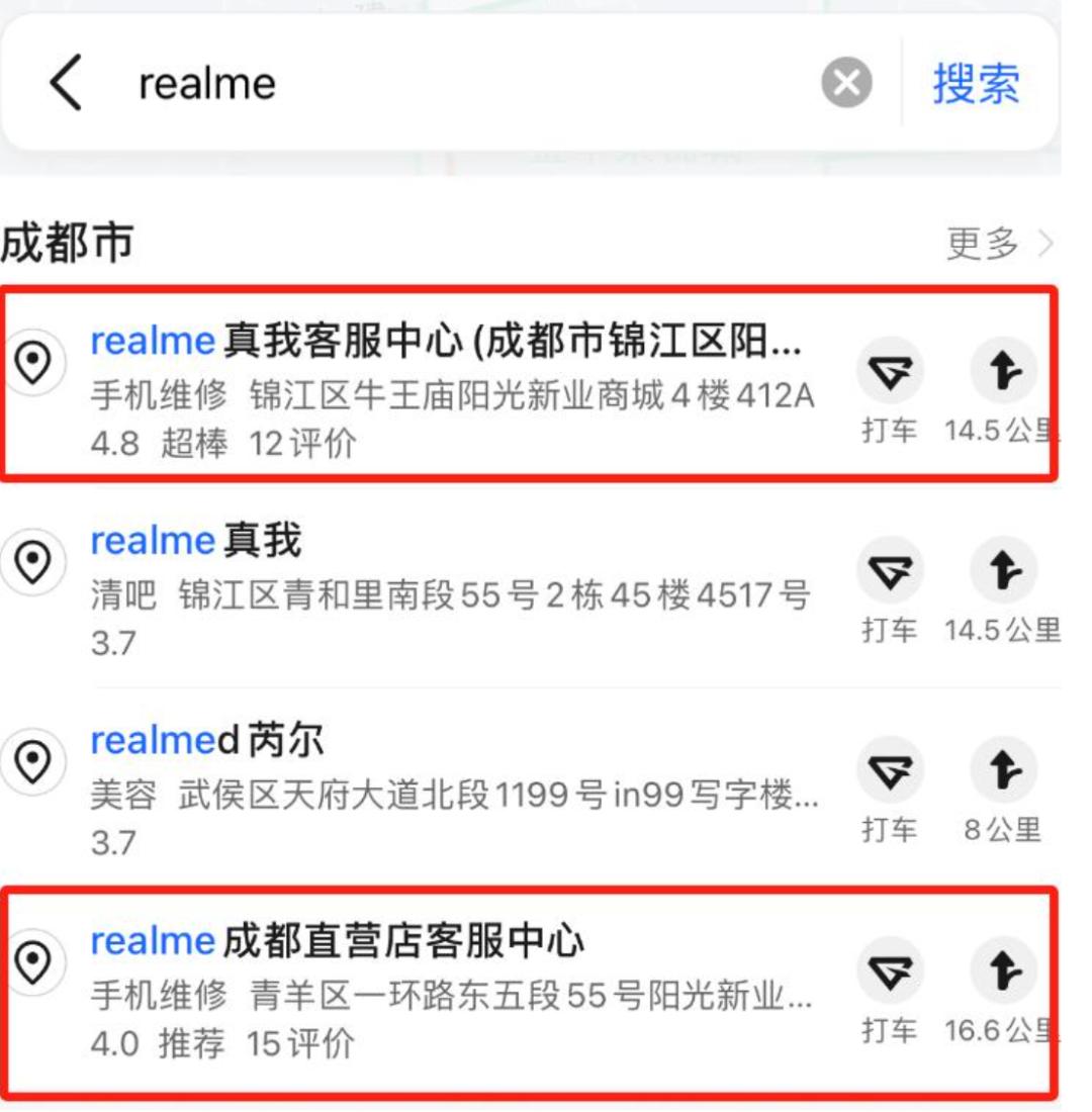 就如同一个不受宠的儿子,22年OPPO干脆将realme“赶出”了自己的售后体系。现在realme手机的售后只能选择寄修或者线下售后点,但无论哪种都不算方便。例如在高德地图中搜索realme,会发现像成都这样的省会城市也都仅有两家线下维修服务点,而寄修的话时间至少也要三五天。