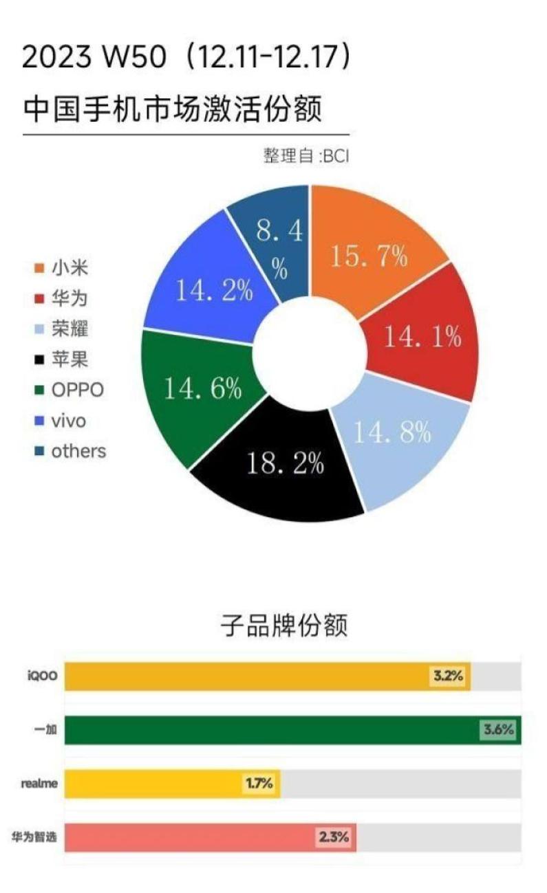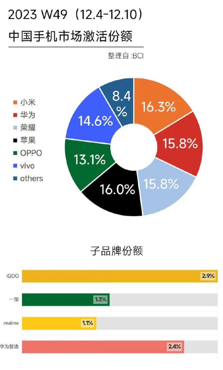 举一个例子,去年12月5号一加12发布,12月7号realme GT 5 PRO发布,二者相隔仅为两天。根据W49、W50的市场激活份额计算,一加W50的销量增长为11万台,而realme仅为2.9万台。相较而言,GT 5 PRO给realme带来的销量增长实在太小。