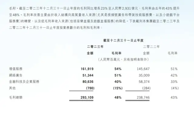 事实的确如此。过去几个季度里,小游戏平台服务费已经影响了腾讯的财报。在2023年年报中,在多项业务承压的情况下,腾讯增值服务业务毛利率同比提升3个百分点。而财报将小游戏平台服务费的占比增加归为第一原因。