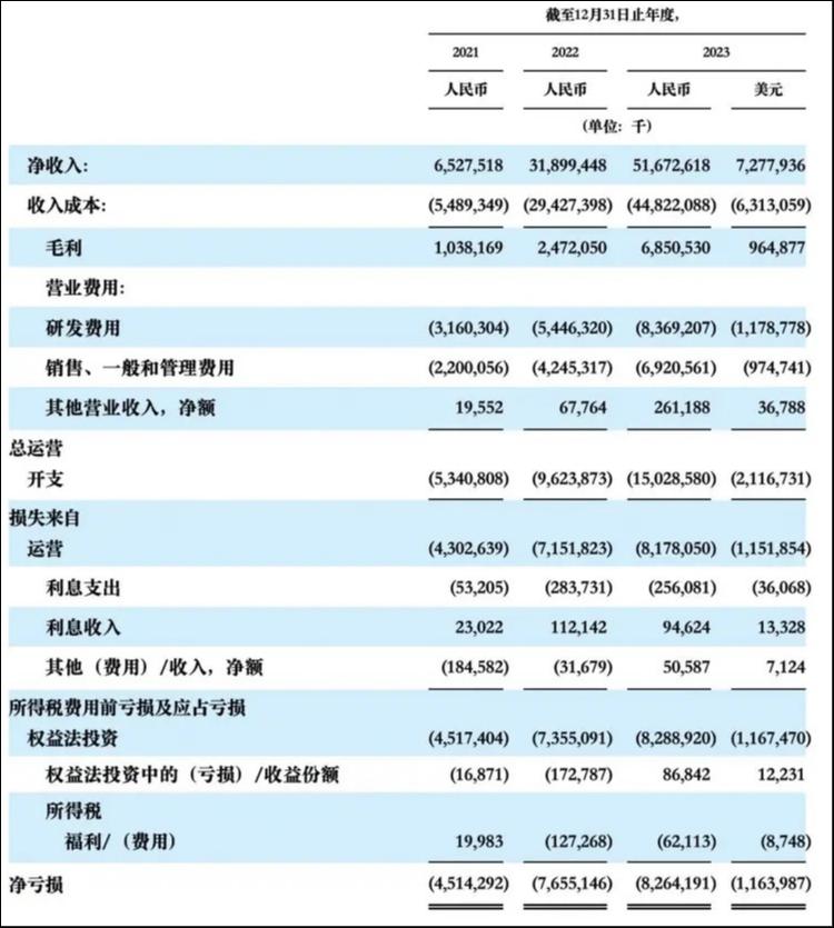 根据招股书显示,2021-2023年,极氪的总收入分别为人民币65.28亿元、318.99亿元及516.73亿元。但同时亏损也分别达到了45.14亿元、76.55亿元,和82.64亿元,三年累计亏损已经超过200亿元。招股书显示,在研发费用上,极氪三年间累计投入约170亿元。其中,2023年极氪研发费用就高达83.69亿元。
