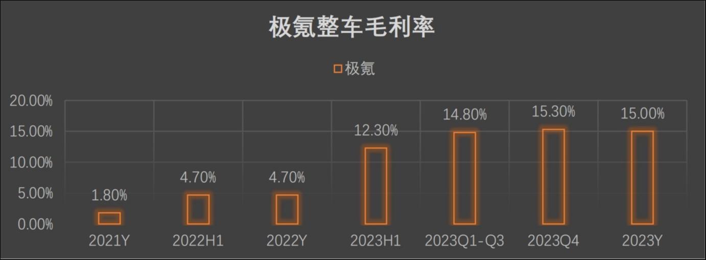 关于何时才能盈利,在上市发布会后的沟通环节,安聪慧再次强调了极氪第一年就实现了正毛利率。小鹏汽车2023年的数据为-1.6%,蔚来为11.9%,特斯拉为18.2%,理想汽车为21.5%,极氪为15%,较2021年的1.8%和2022年的4.7%均大幅增长。同时,他表示:“特斯拉要100万台才开始赚钱,我相信未来极氪会以更小规模达成盈利。”